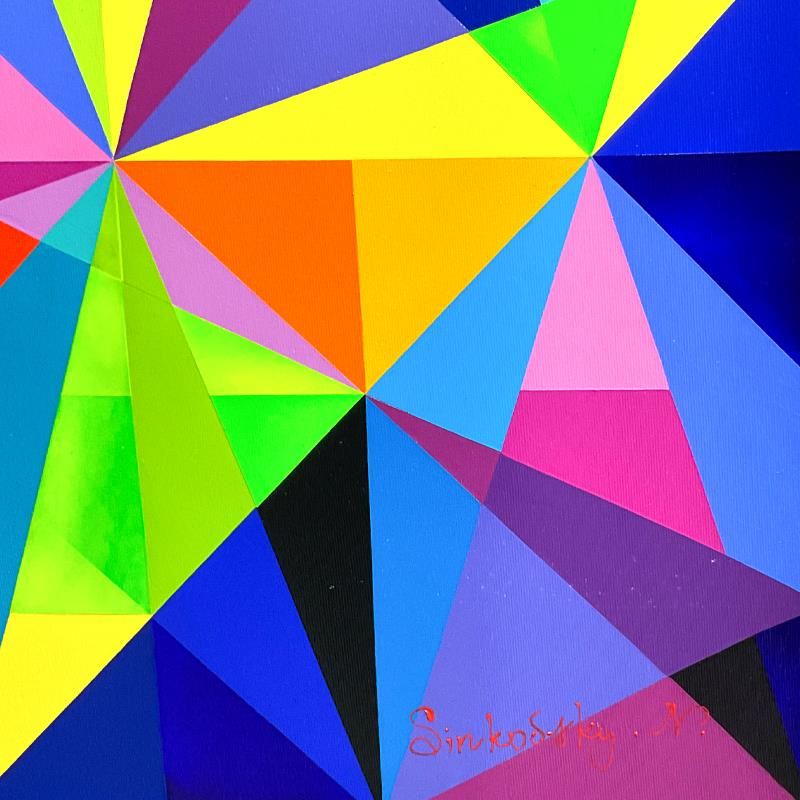 This is an original acrylic painting on canvas by Natalia Sinkovsky, hand signed by the artist. Includes Letter of Authenticity. Measures approx. 24" x 24" (image). There are several faint patches on the canvas that appear to be remnants of taped used by the artist.