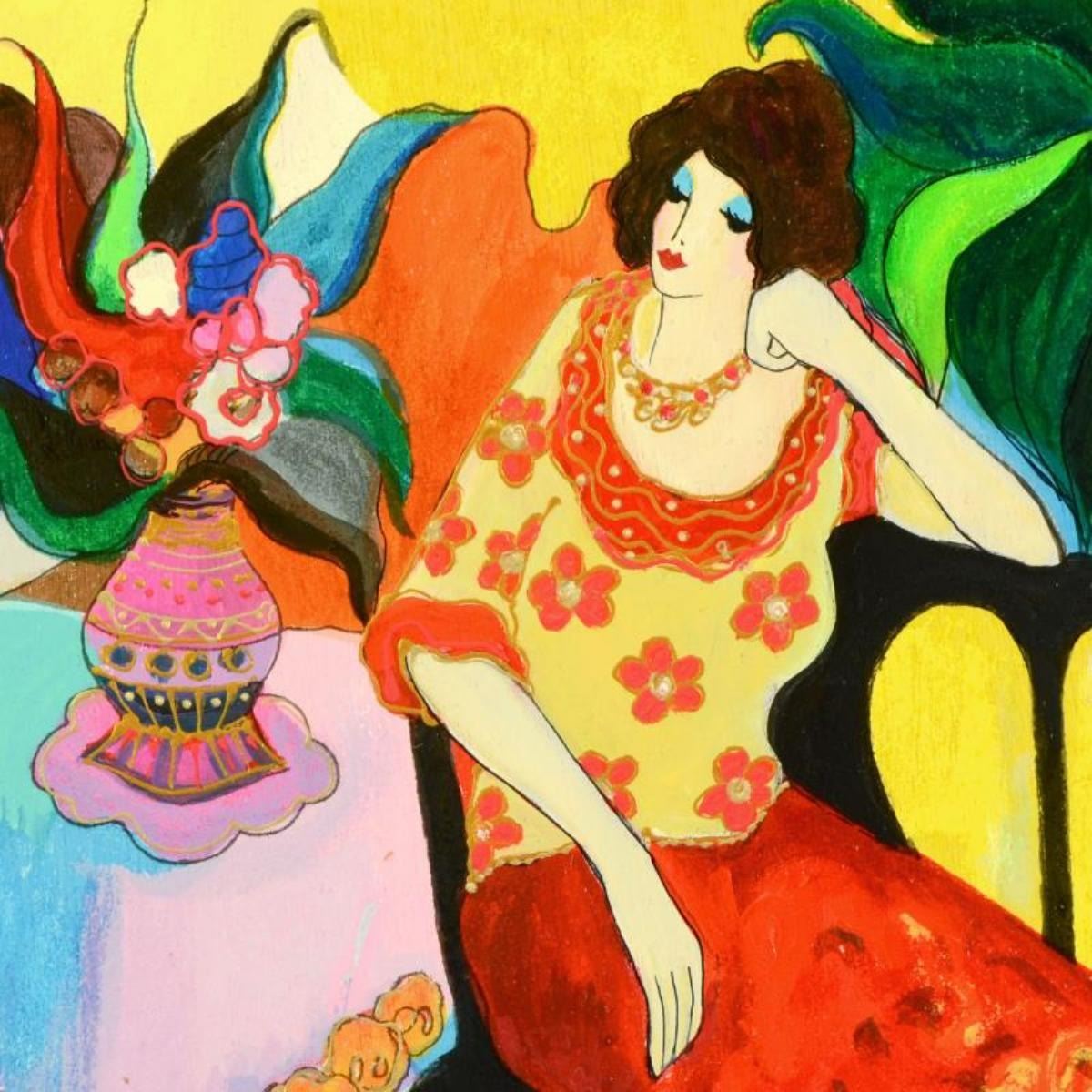 This is a one-of-a-kind acrylic over paint on wood panel by Itzchak Tarkay (1935-2012), hand signed by the artist. Includes Letter of Authenticity. Measures approx. 12" x 9" (image).