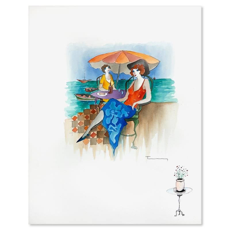 This is an original watercolor painting on paper by Itzchak Tarkay (1935-2012), hand signed by the artist. Includes Letter of Authenticity. Measures approx. 22" x 30" (image). There is very light and sparse spotting in the white part of the paper.