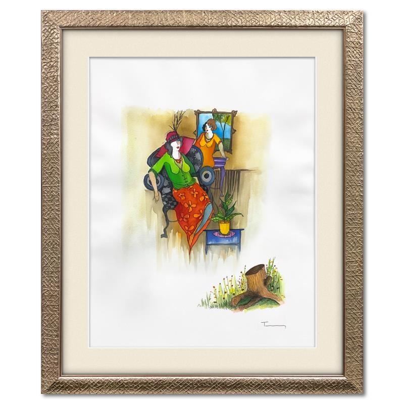 This is an original mixed media watercolor on paper by Itzchak Tarkay (1935-2012), hand signed by the artist. This piece comes custom framed. Includes Letter of Authenticity. Measures approx. 38.5" x 31" (frame), 30" x 22" (image). The paper is slightly wavy due to the nature of the watercolor medium.