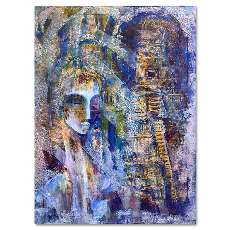 This is an original acrylic painting on stretched canvas by Nadia Volna, hand signed by the artist. This piece is painted with light-reactive black light paint that reveals brilliant colors when viewed under incandescent light. Includes Letter of Authenticity. Measures approx. 24" x 18" (image).