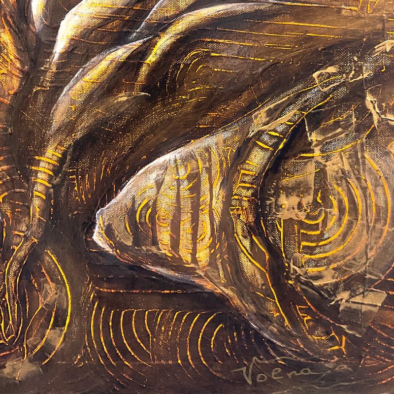 This is an original acrylic painting on stretched canvas by Nadia Volna, hand signed by the artist. This piece is painted with light-reactive black light paint that reveals brilliant colors when viewed under incandescent light. Includes Letter of Authenticity. Measures approx. 24 x 36 (image).