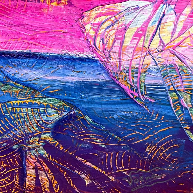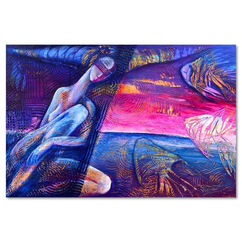 This is an original acrylic painting on stretched canvas by Nadia Volna, hand signed by the artist. This piece is painted with light-reactive black light paint that reveals brilliant colors when viewed under incandescent light. Includes Letter of Authenticity. Measures approx. 24" x 36" (image).