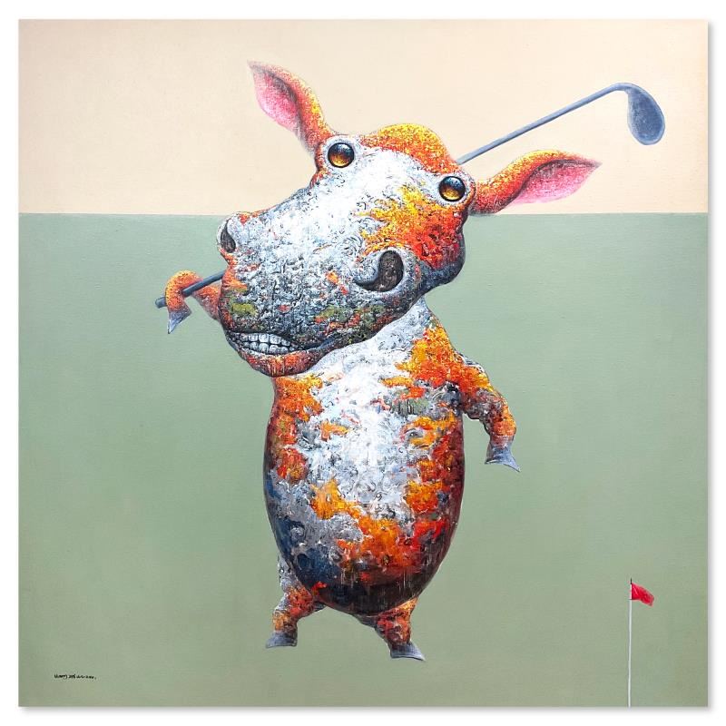 This is an original mixed media painting on canvas by Wang, hand signed by the artist. This piece comes gallery wrapped. Includes Letter of Authenticity. Measures approx. 55" x 55" (image). There are minor imperfections on the canvas, including scuffs and several hairline cracks that are only noticeable upon close inspection.