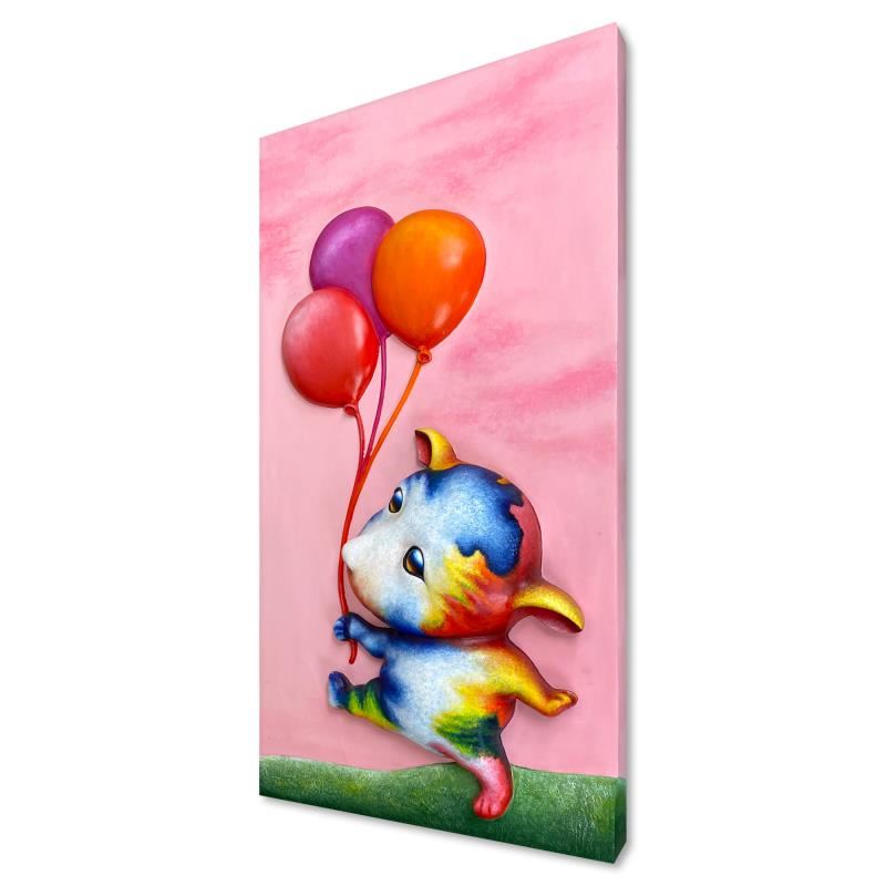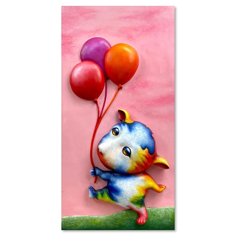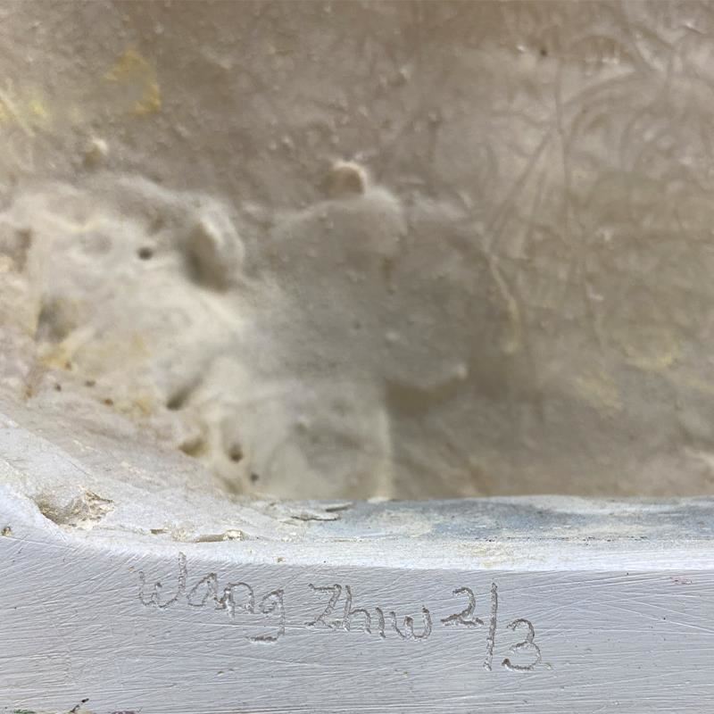 This is a hand painted limited edition, dimensional art, bas relief sculpture by Wang. This piece is numbered 2/3 and hand signed in verso. Includes Letter of Authenticity. Please note there are some hairline cracks on the face of the solid color potions of the image that are only noticeable upon close inspection. Measures approx. 47" x 23.5".