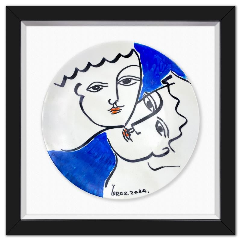 This is a hand painted ceramic plate by Yuroz, hand signed by the artist. This piece comes custom framed floated on linen. Includes Letter of Authenticity. Measures approx. 15.5" x 16" (frame), 11" (diameter). This item requires special handling and may have a longer than usual turnaround.