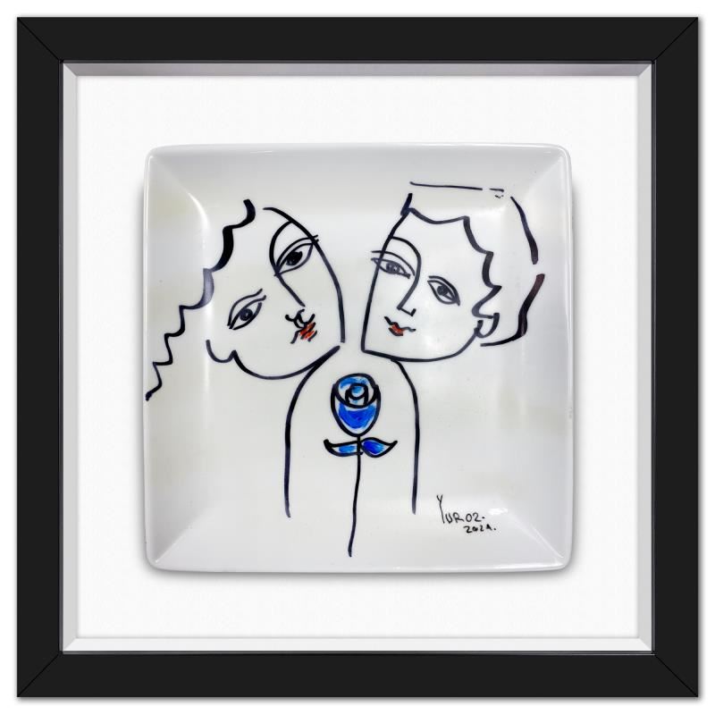 This is a hand painted ceramic plate by Yuroz, hand signed by the artist. This piece comes custom framed floated on linen. Includes Letter of Authenticity. Measures approx. 15.5" x 15.5" (frame), 10" (diameter). This item requires special handling and may have a longer than usual turnaround.
