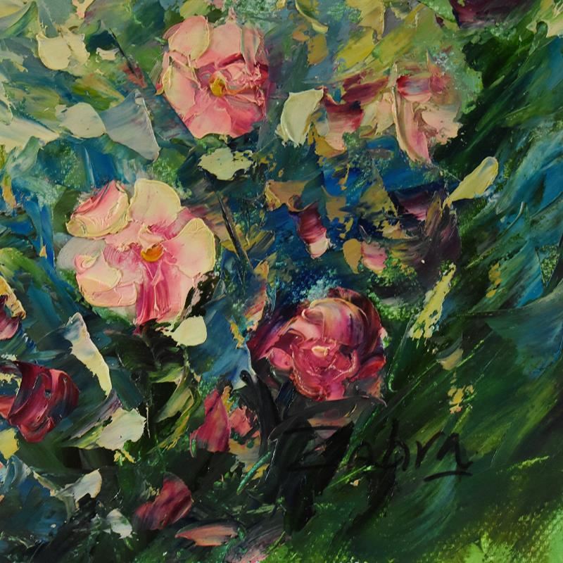 This is an original acrylic painting on canvas by Zahra, hand signed by the artist. Includes Letter of Authenticity. Measures approx. 24" x 24" (image).