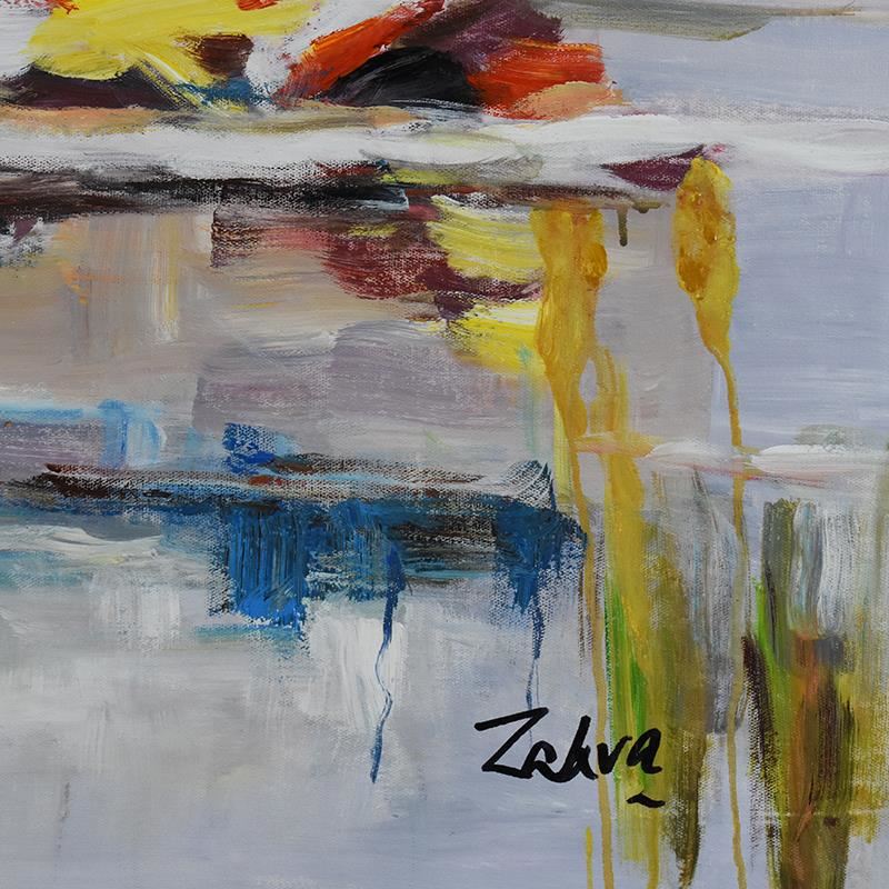 This is an original oil painting on canvas by Zahra, hand signed by the artist. Includes Letter of Authenticity. Measures approx. 44" x 44" (image). Please note: There are creases on the canvas (primarily white border area) from being improperly rolled; these imperfections may be concealed when framed.