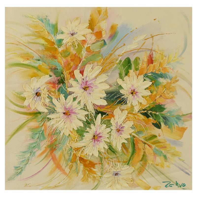This is an original oil painting on canvas by Zahra, hand signed by the artist. Includes Letter of Authenticity. Measures approx. 24" x 24" (image). There is a horizontal crease on the bottom-right part of the image that may be concealed when the piece is framed.