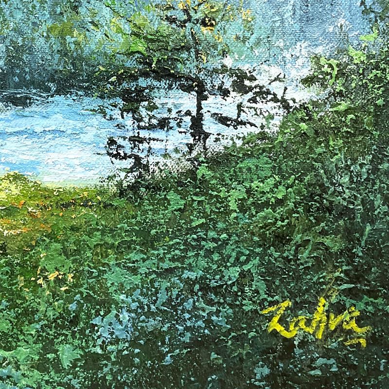 This is an original acrylic painting on canvas by Zahra, hand signed by the artist. Includes Letter of Authenticity. Measures approx. 49.5 x 49.5 (image).