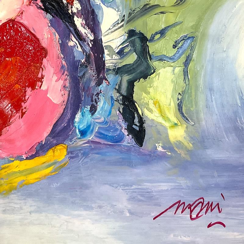 This is an original acrylic painting on canvas by Zahra, hand signed by the artist. Includes Letter of Authenticity. Measures approx. 46" x 46" (image).