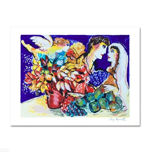 With bright colors and soft brushstrokes, Zamy Steynovitz (1951-2000) created feminine romanticized scenes with a playful nature. This is an untitled limited edition serigraph on paper, from an AP edition and hand signed by Steynovitz. This piece was acquired in a gallery close-out and there is no specific certificate information available. Measures approx. 24" x 18" (with border), 19.5" x 15" (image).