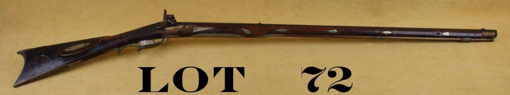 Untouched “out-of-the-attic” condition back action percussion full stocked striped maple stock rifle, .38 cal., 33-1/2” octagon barrel, brown finish, nickel silver trigger guard, butt plate and ornamentation. Thisgun is in overall fair + condition showing a heavy brown patina and scattered erosion on metal surfaces, set trigger working at time of description, dark bore, overall fair + to good wood with some old loss at the bolster;replaced wood ramrod and front metal cap of stock missing. A great gun to hang over a fireplace in a mountain cabin. Est.: $300-$600.