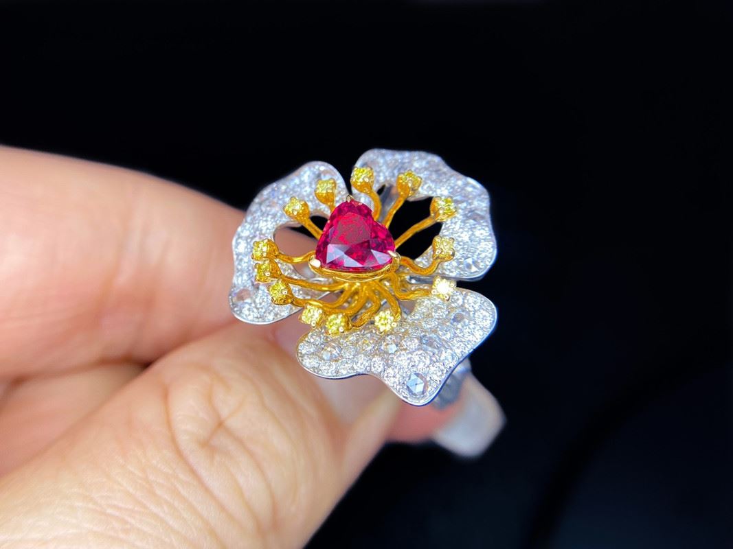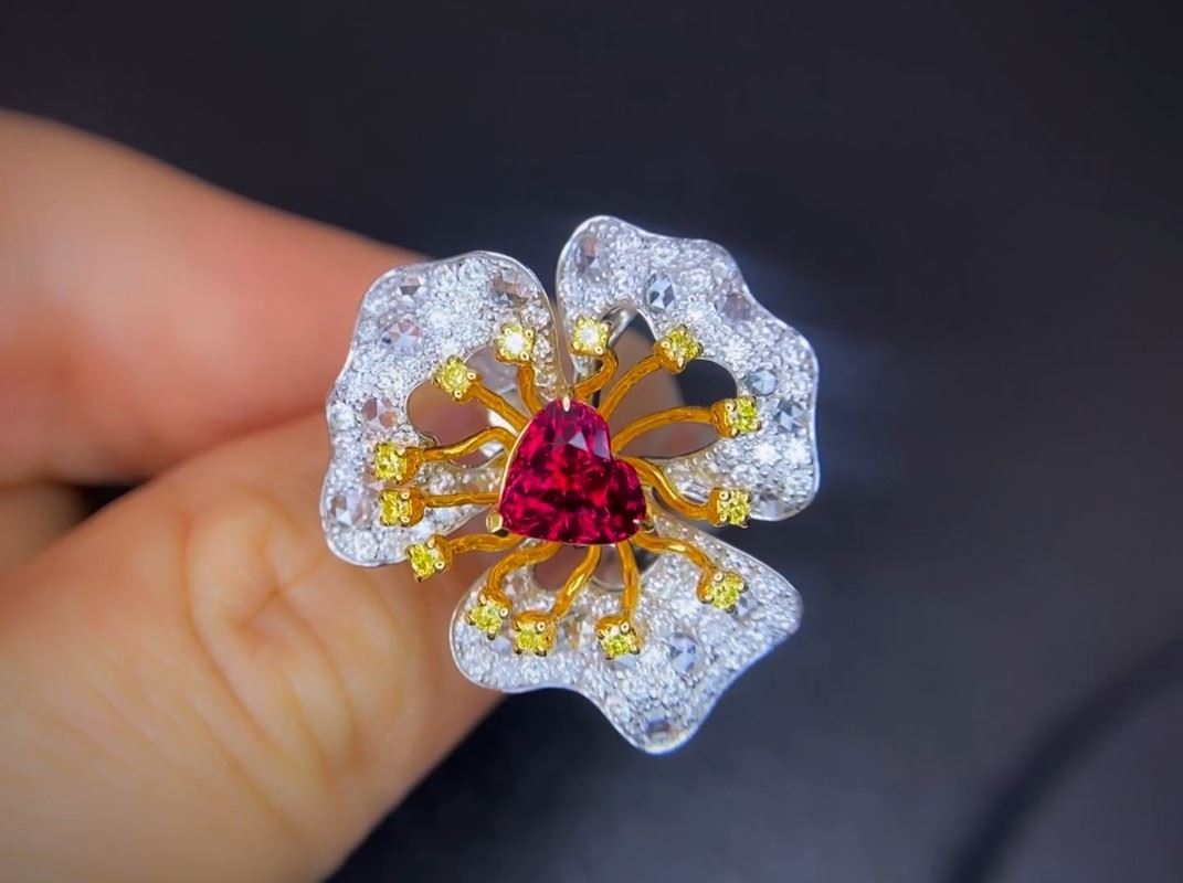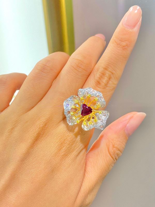 This ring features an untreated pigeon blood red Mozambique ruby at its center, surrounded by an exquisite flower design with sparkling diamonds and yellow gemstones. The ruby shines like a heart, while the golden-yellow stones and delicate diamond petals complement each other, showcasing the unique charm of jewelry artistry. Each petal and the fine golden details add elegance and luxury to the piece, making it a rare and valuable collectible masterpiece.Ring size: 6, circumference: 52 mm, diameter: 16.6 mm, main stone: 1.54ct, side diamonds: 1.517ct. Note: Comes with a GRS report.