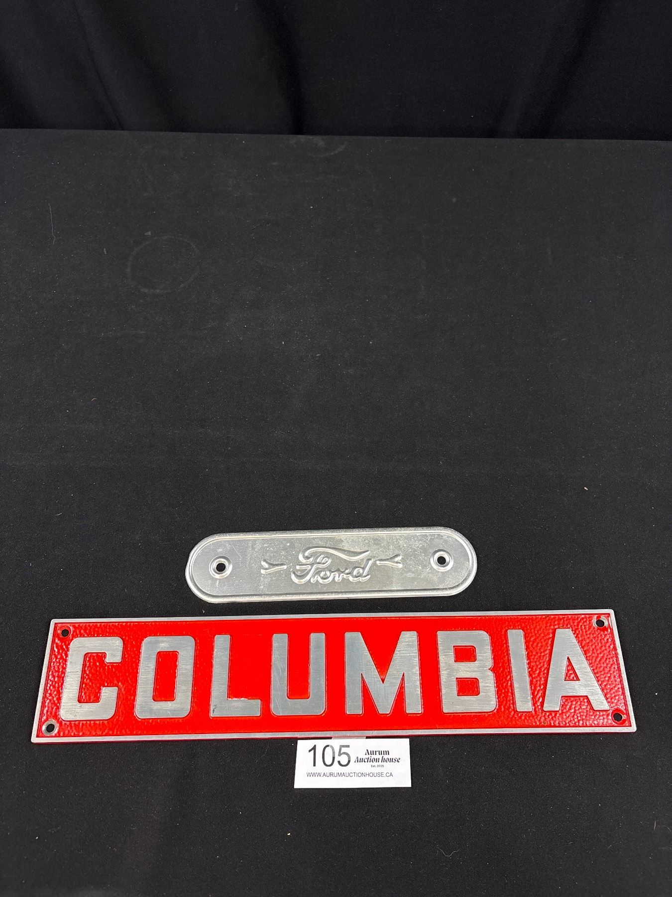 Unused Cast Metal Columbia Trailor Plate + Ford Embossed Door Jam Plate