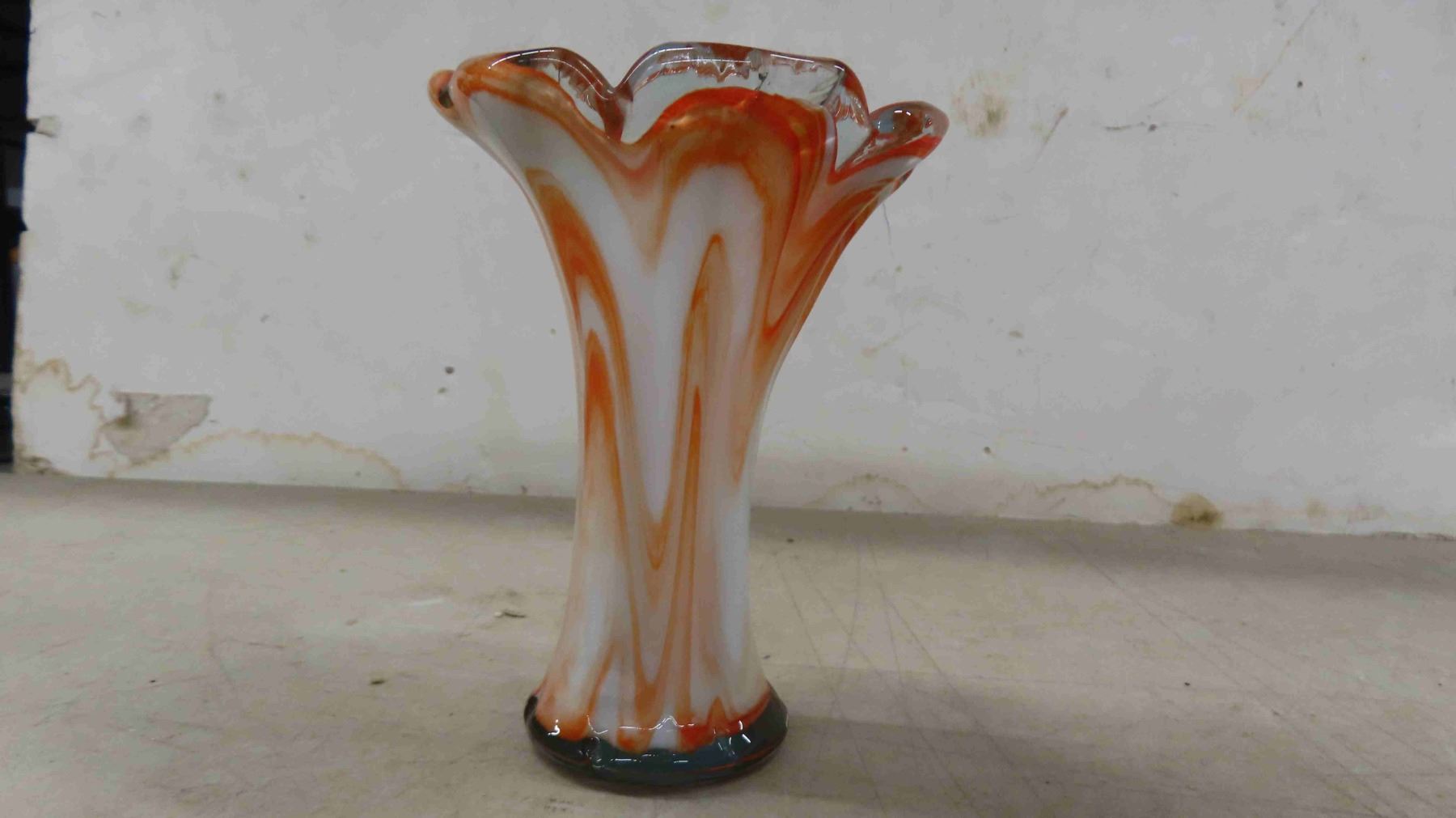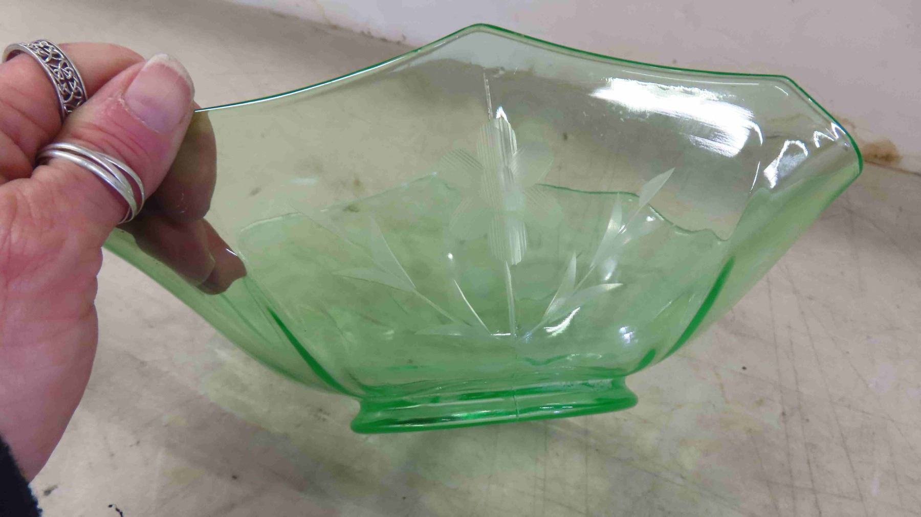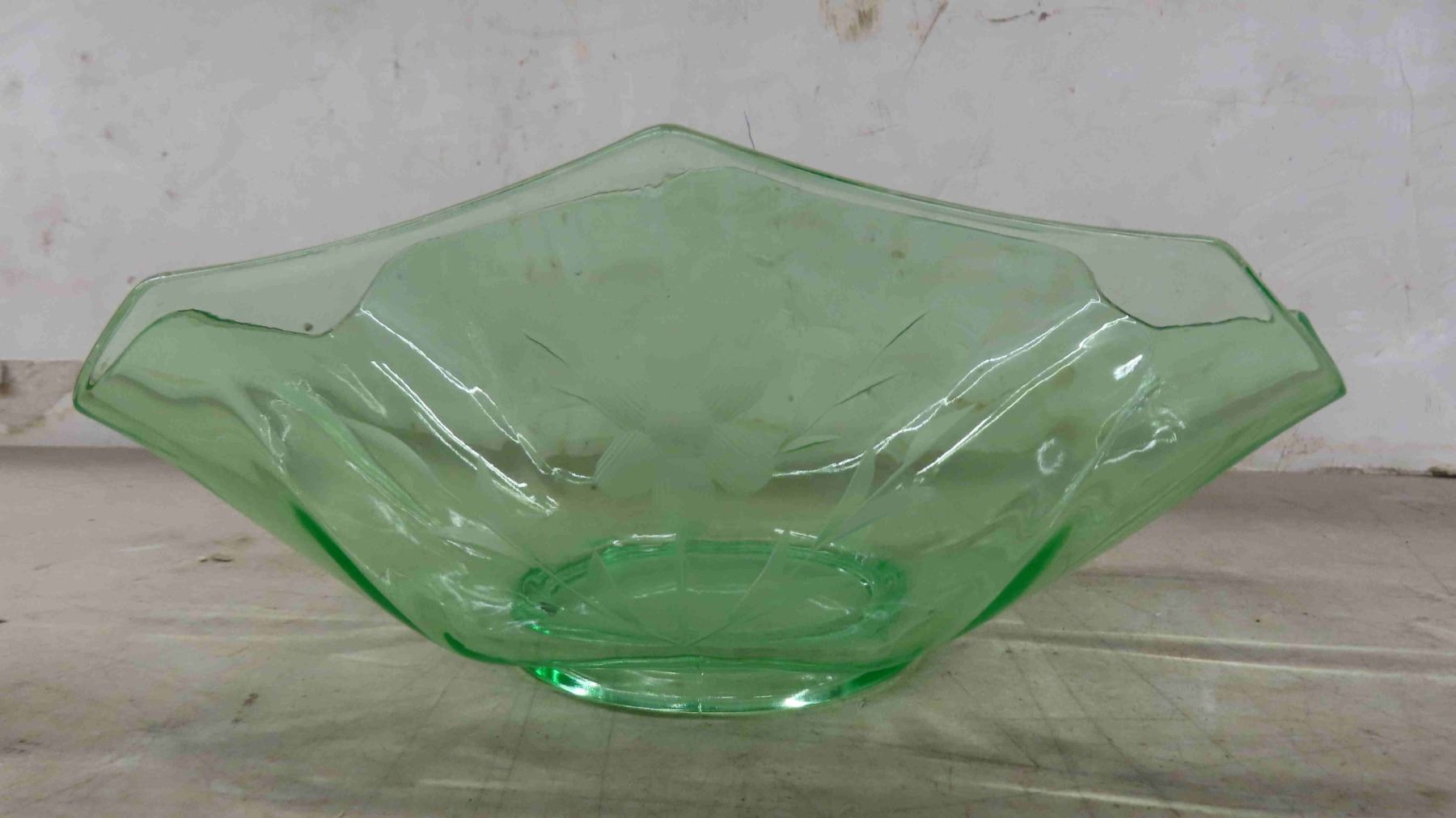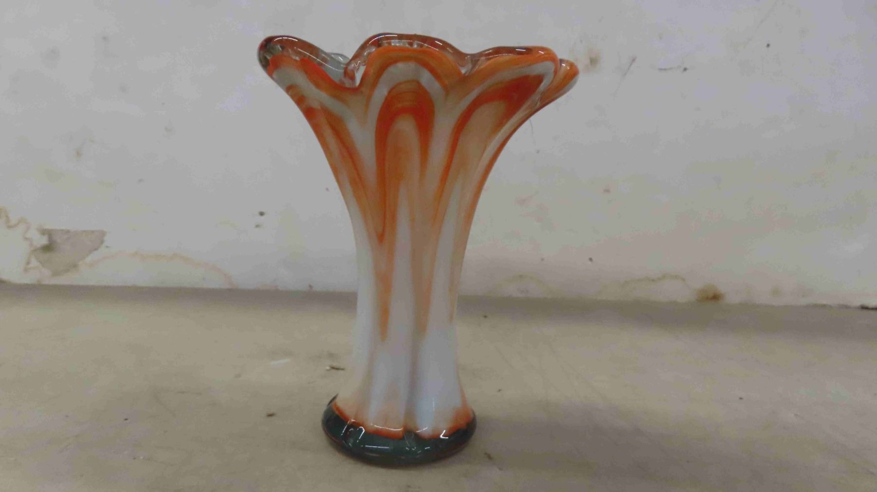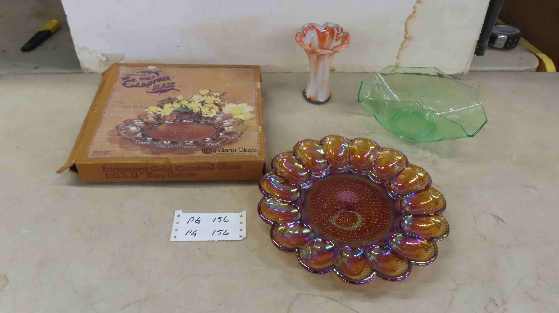 Unused In Original Box Gold Carnival Glass Devil Egg Plate - Mint Indianan Glass, 1930s Green Glass Table Centerpiece Fruit Bowl Boat, Murano Style Hand Blown Art glass Vase 5.75"