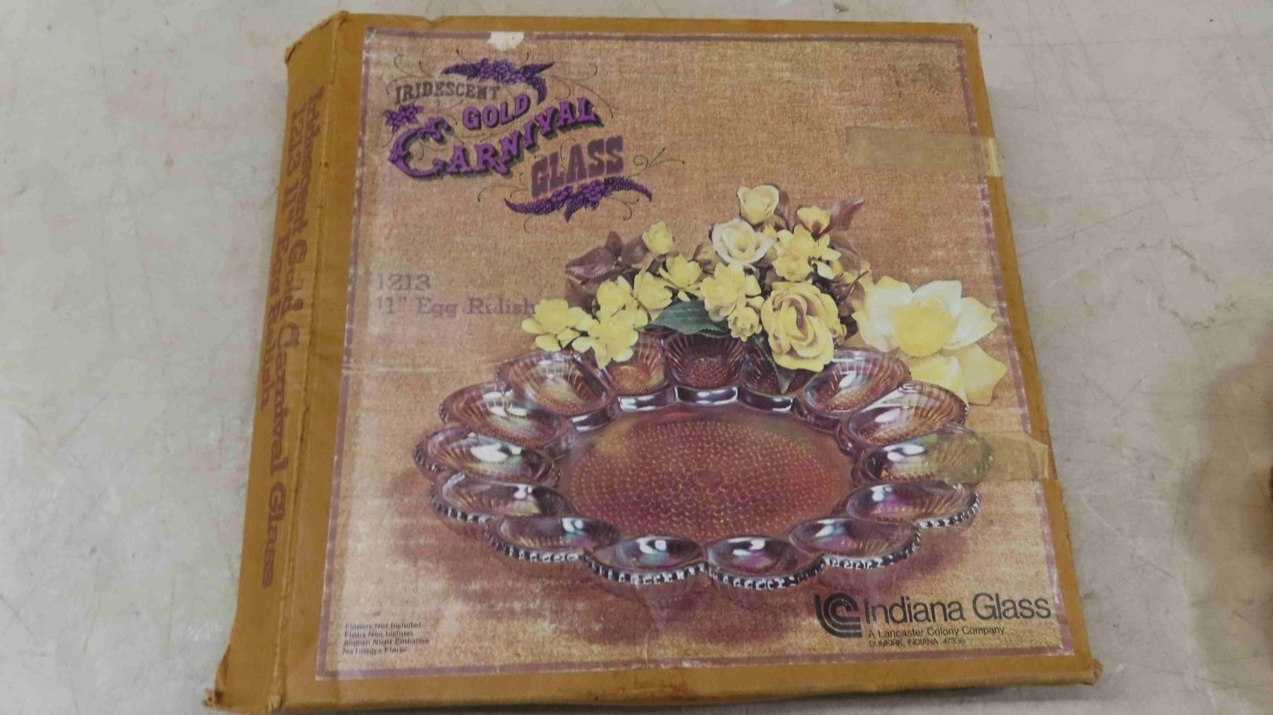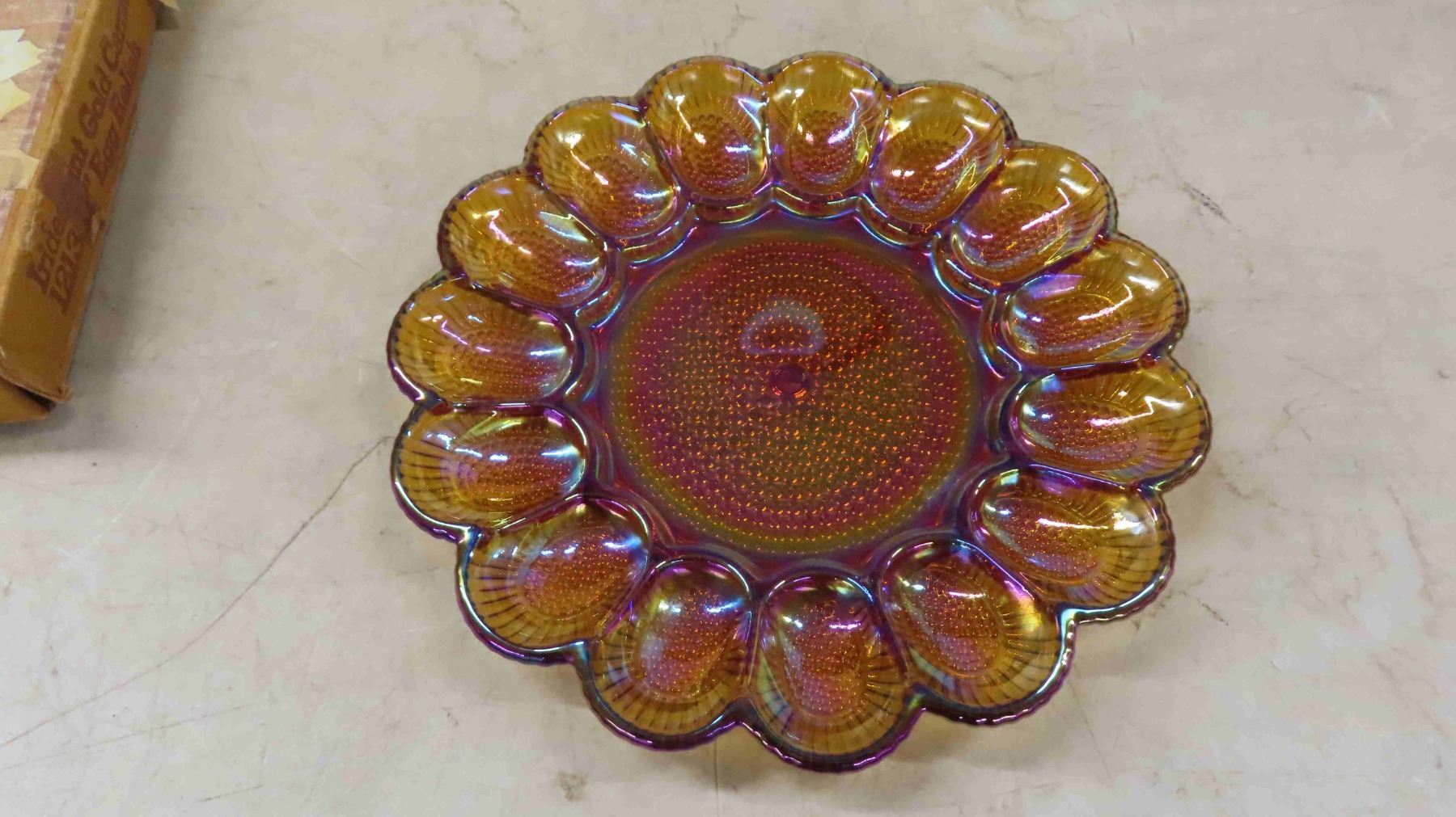 Unused In Original Box Gold Carnival Glass Devil Egg Plate - Mint Indianan Glass,