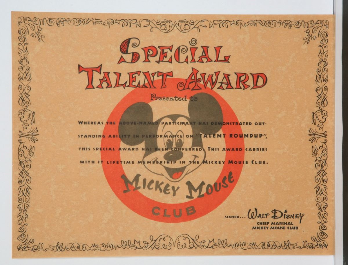 (Walt Disney Studios, 1955) Unused Mickey Mouse Club Special Talent Award. Printed on Parchment paper, these awards were presented to child guest stars who appeared on Talent Roundup Day on the original 1950's TV series. Measures 10"x13" and is in fine condition.