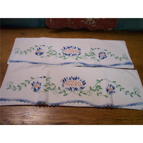 I will be listing a number of pair of pillowcases that I purchased all from the same elderly lady.I do not believe that any of them have ever been used.The needlework is just beautiful on all of them.This pair has beautiful florals in blues.All the sets would be wonderful for a B&B.Wonderful sturdy material.
