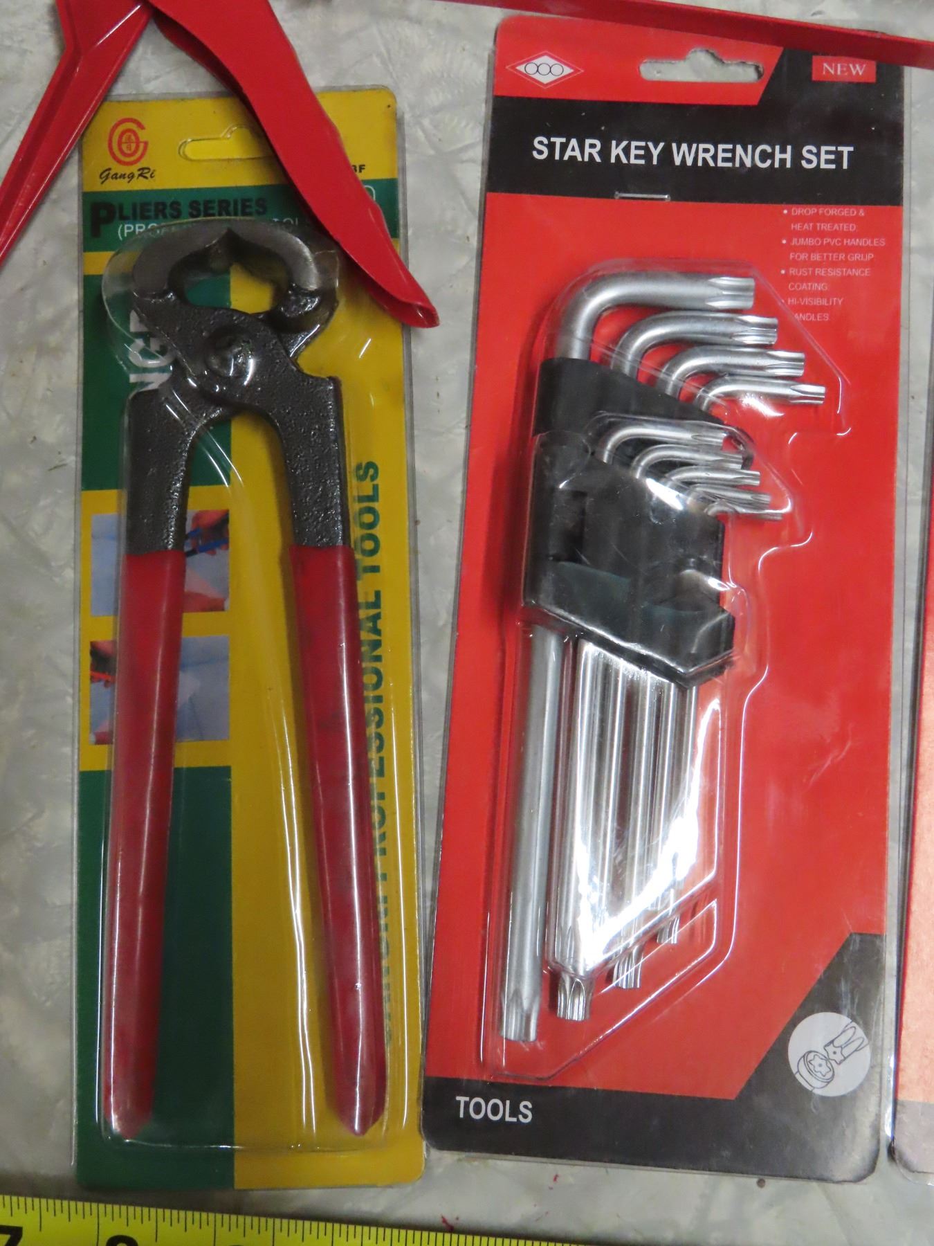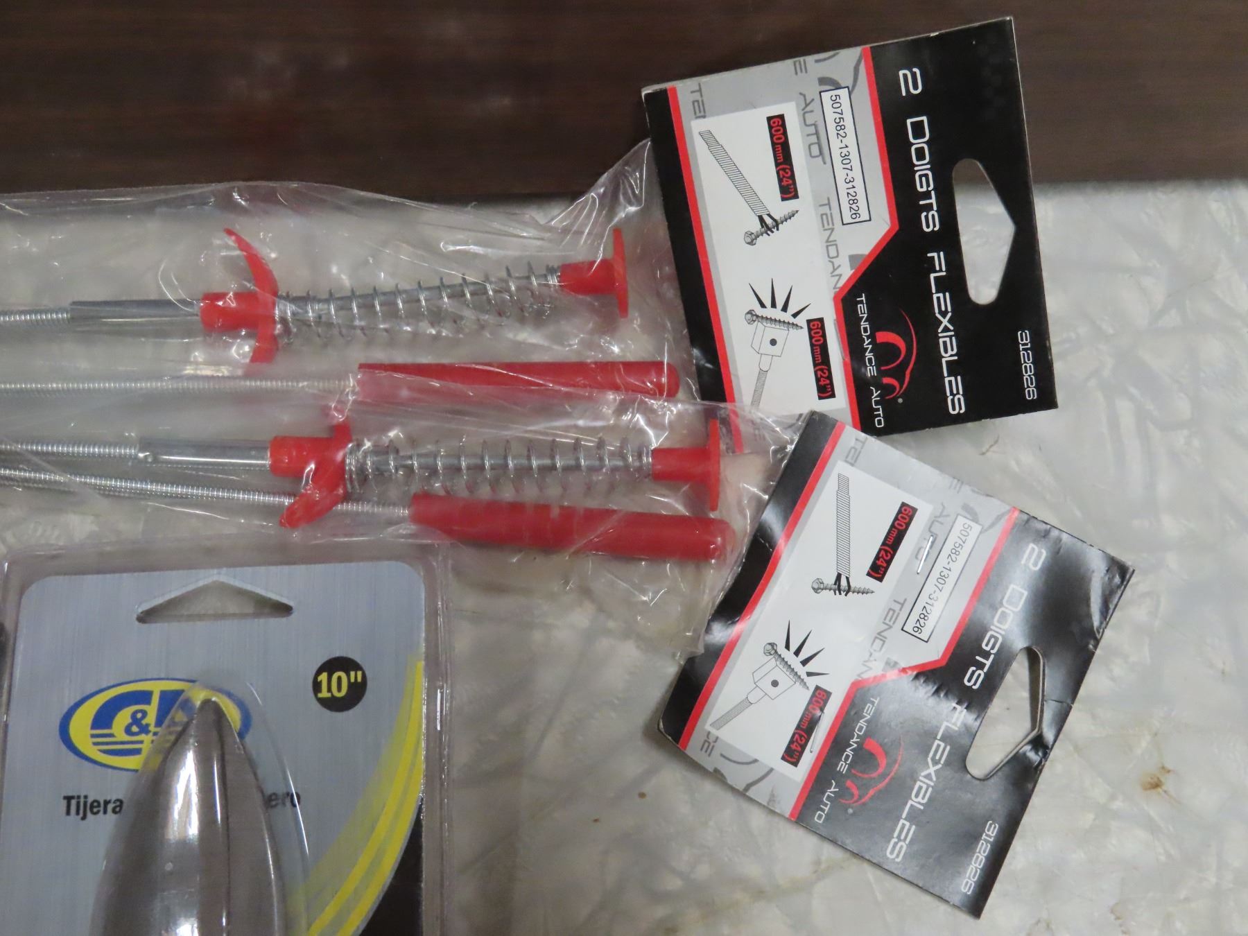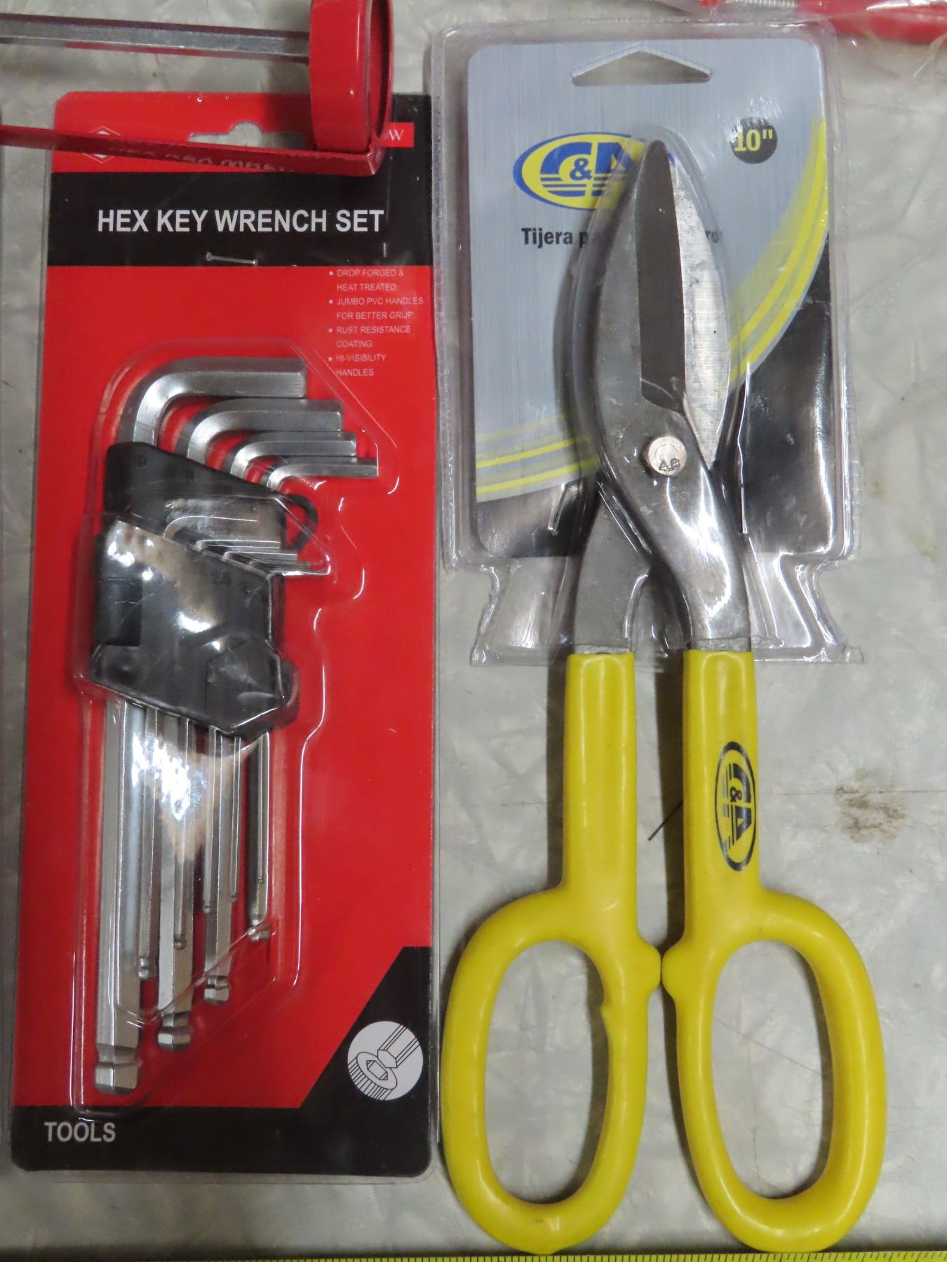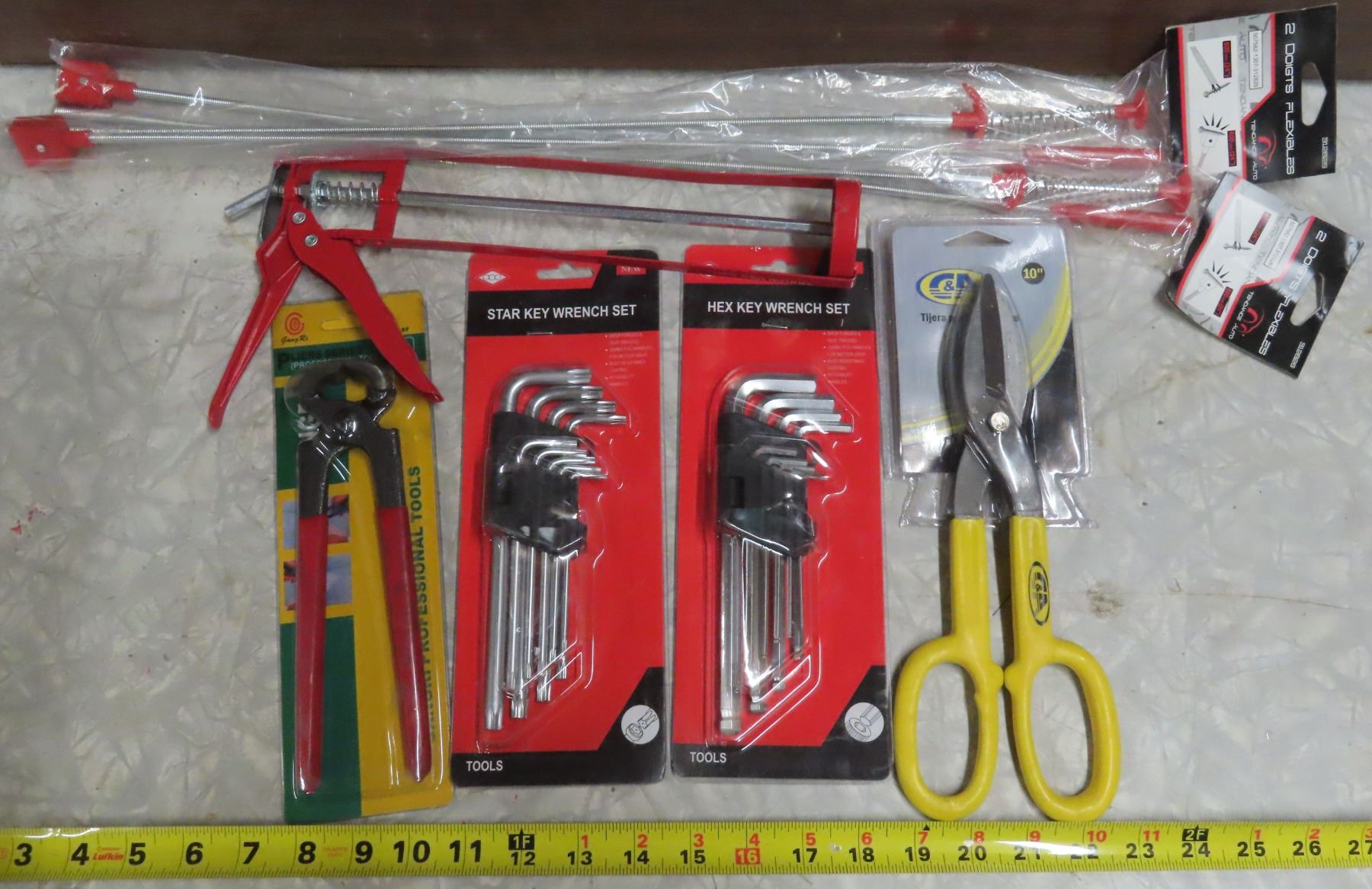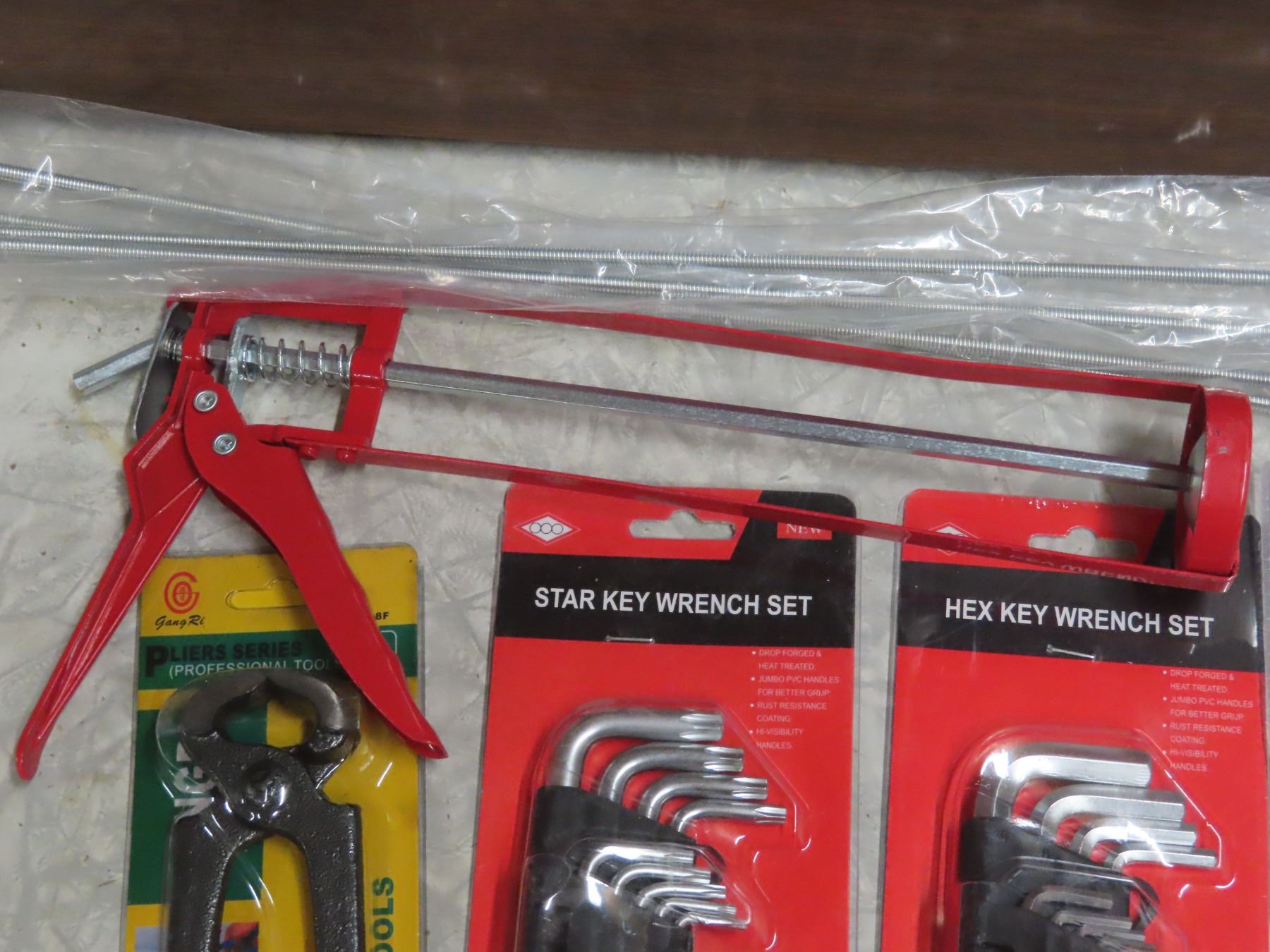 Unused caulking gun, wire cutters, hex key wrench, star key wrench, 10" snips & 2 doigts flexibles