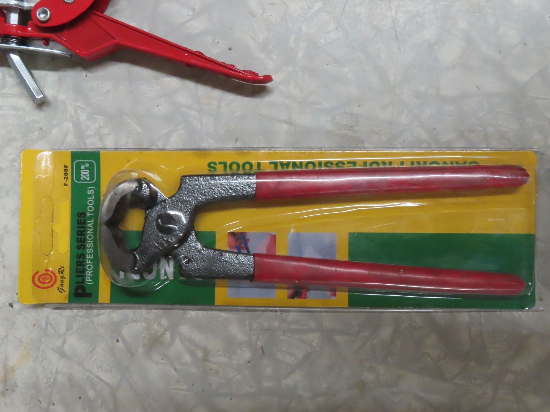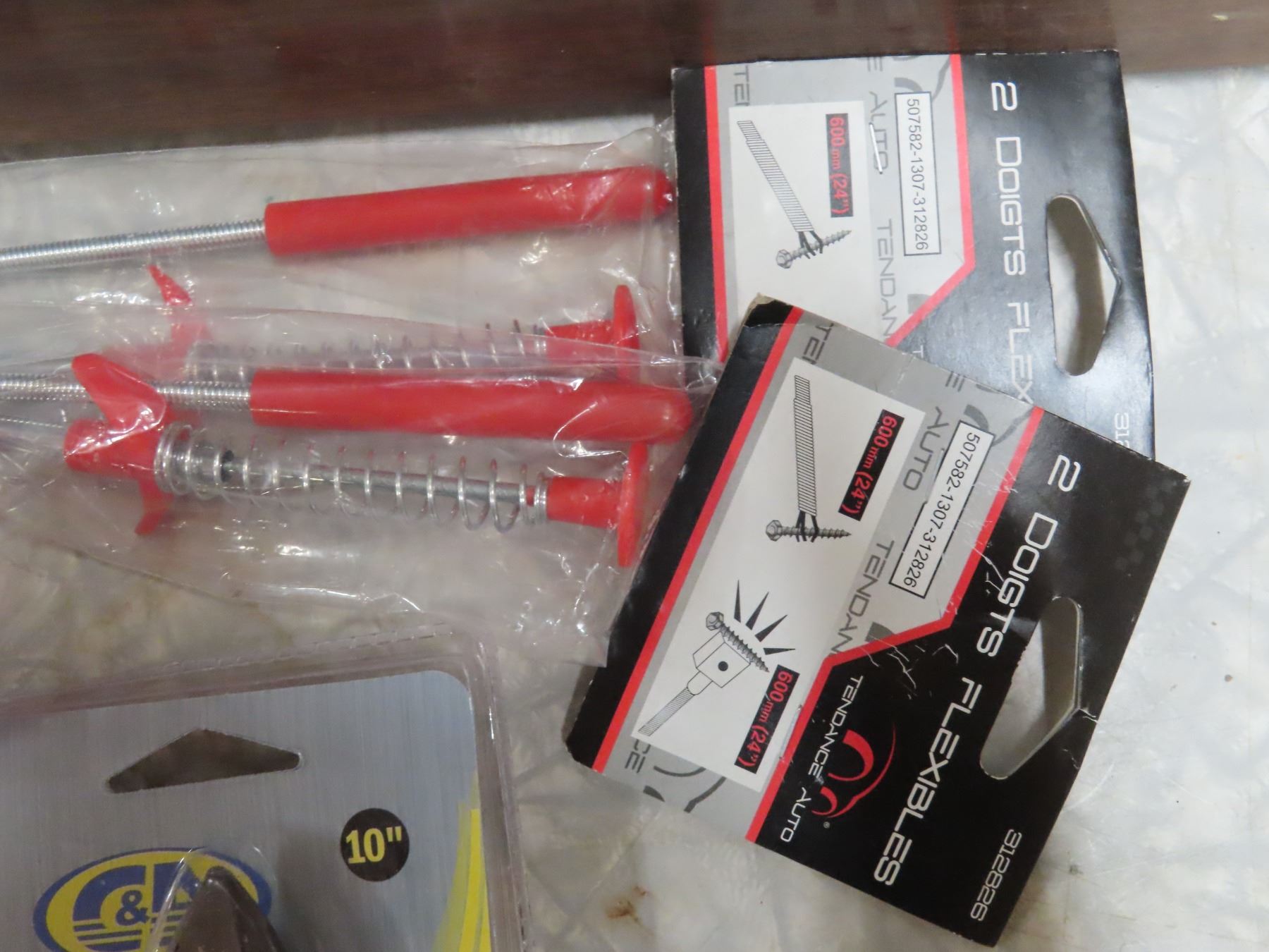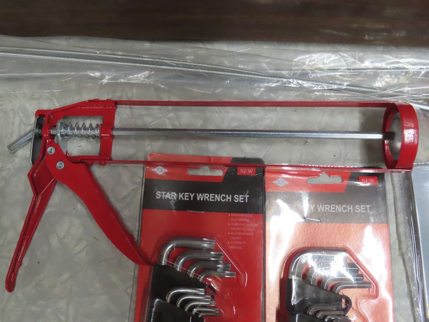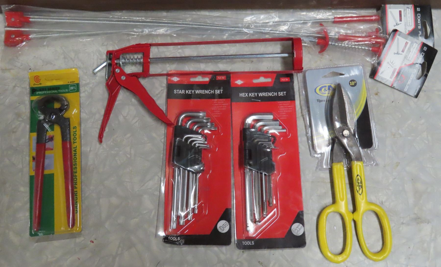 Unused caulking gun, wire cutters, hex key wrench, star key wrench, 10" snips & 2 doigts flexibles