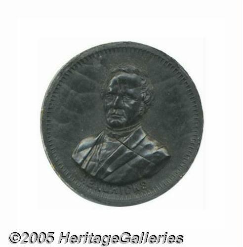 <B>Unusual 1876 Tilden - Hendricks Pressed Celluloid Token</B></I> SJT 1876-20 in Sullivan and a companion piece to RBH 1876-31. Made in five colors, this is the black version. Very brittle item, and few have survived in this great intact condition. From the former Joe Brown Collection. 25 mm. Lot:259
