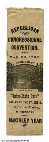 <B>Unusual 1896 Minnesota Convention Ribbon for William McKinley</B></I> This is the only example of this distinctive design we have seen. Attractive woodcut of the Falls in the center. Excellent condition. Length 8". Lot:260