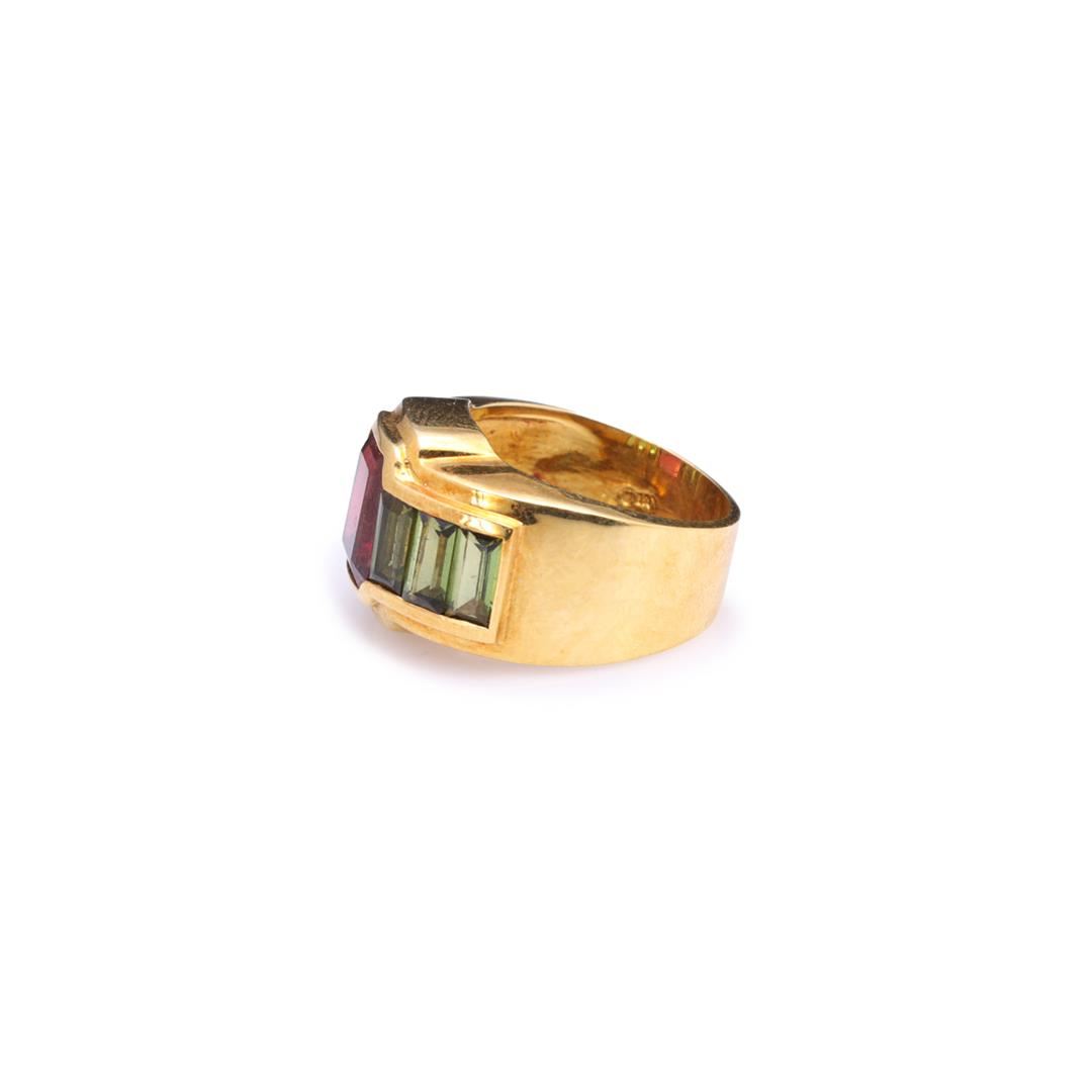Unusual 18k yellow gold ring; a center large deep pink tourmaline flanked by three green torumalines on each side, interior band marked 18k with hallmark; gross weight 12.2, size 6 1/4