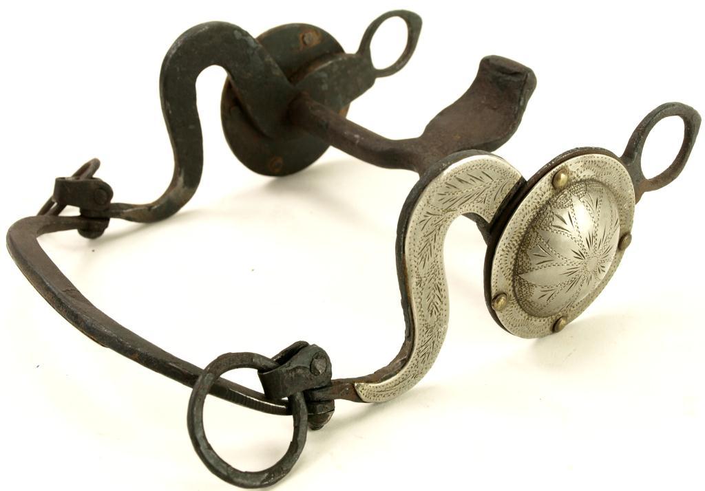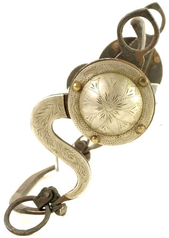 silver engraved cheeks with large conchos, silver overlay to slobber bar. Unmarked, original rein rings attached.