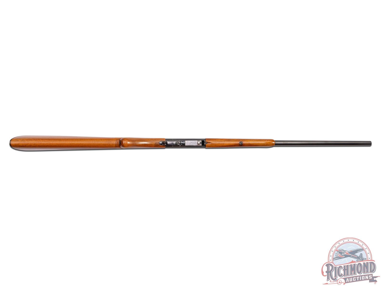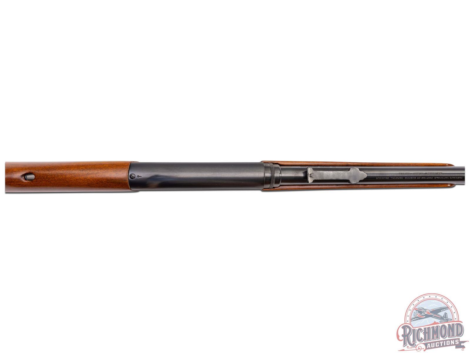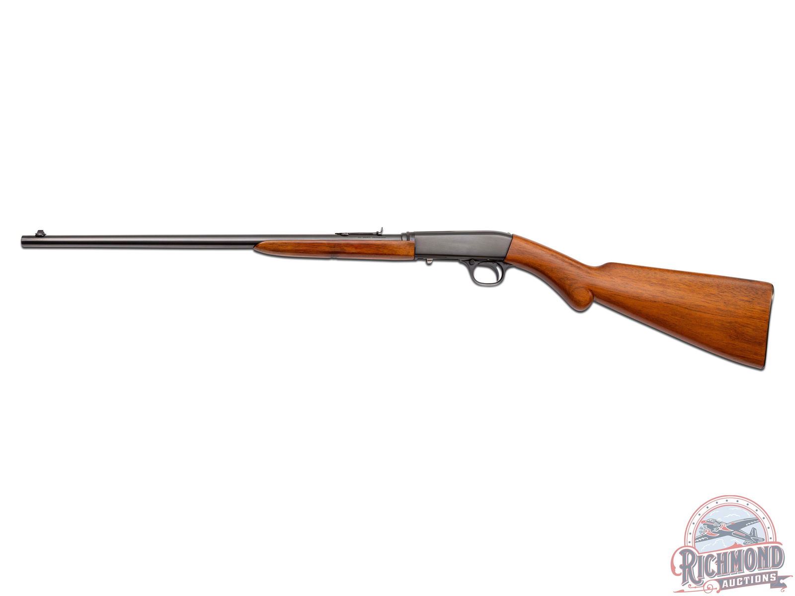Made in Belgium by Browning, circa 1914. This rifle is generally not seen in this country due to the fact that they were not imported until 1956 as the "SA" model. 19-1/4" blued round barrel in 22 Short caliber with bead pedestal front sight and stamped steel rear notch sight with Browning Herstal address and caliber markings. Blued takedown receiver with "FN" marked trigger guard, push button safety and Belgium proofs on bolt. Plain walnut stock with Model "A" style loading port in front of comb on tang. Round knob pistol grip architecture stock with blued smooth butt plate and tubular magazine. Matching plain walnut splinter forearm. Seldom seen gun in this country. CALIBER: 22S. S/N: 23358. FFL STATUS: Curio & Relic.