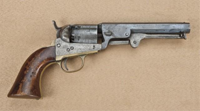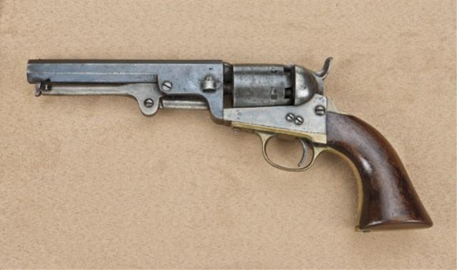 Unusual Brevette Colt 1849 pocket model, .31 caliber percussion, 5-1/16” barrel, 9-3/4” overall, blue and case hardened finish, rolled Dragoon and Indian fighting scene, serial #6510. The barrel shows a Colt Brevette stamp which is reversed as to read from breech to muzzle or left-handed. The right side of frame shows “A” “F” and crown stamp, possibly August Francott. With Belgian proofs on rear of barrel and cylinder. The revolver shows 60-70% blue on barrel that is toning, 20% blue on cylinder, most all of its cylinder scene, and Colt’s Patent on cylinder script. The frame, hammer, and loading lever show 50-70% case hardening going to patina. The grips are good with scaling varnish of which approx. 30-40% remains. Grips show some small marks and wear at the edges. There is the number “40” stamped on left front of frame near breech of barrel. #6510 is stamped on barrel, frame, trigger guard. The number “18” is reversed on the butt near the screw. The action is good, generally good overall. An intriguing Brevette, particularly with the Colt patent and Colt brevette markings. Est: $700 - $1,400