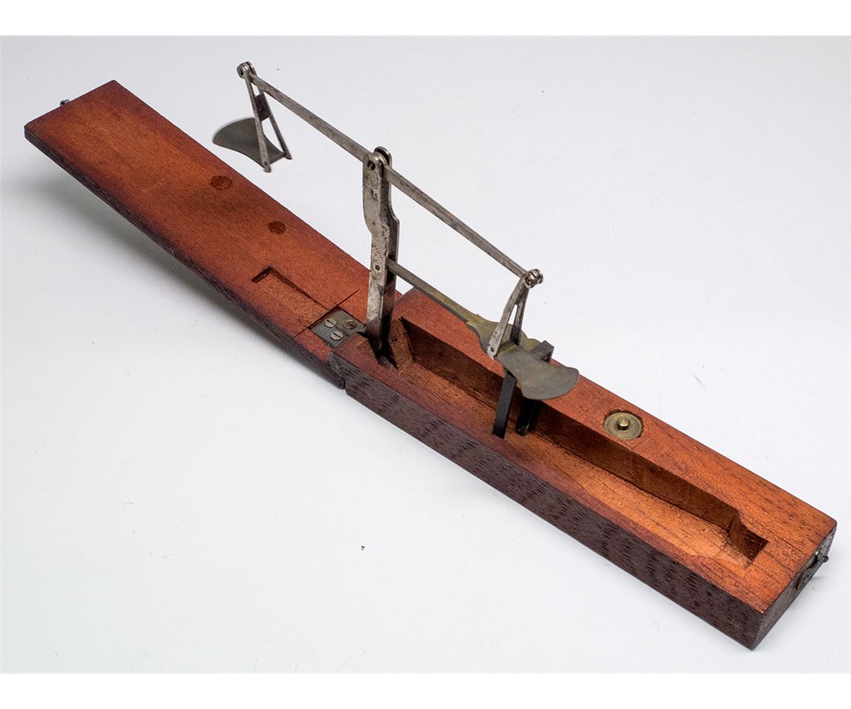 c1813 A rather strange piece, this detector unfolds to reveal two weights for balance. When unfolded the piece measures 10.25” x 4” tall. The name “READ” is inscribed on one side. It is possible that this piece is post Guinea (1813) but perhaps mid nineteenth century. From the J.J. Ford Collection. - HKA#66191