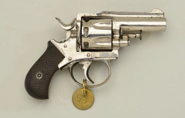 Unusual Bull Dog style DA revolver by Thomas Ryan Pistol Mfg. Co. of Norwich, CT. marked “Ryan’s New Model” on the top barrel rib, .32 cal., 2-1/4” barrel, nickel finish, checkered hard rubber grips, #T52. This gunis in overall very good condition showing approx. 70% original nickel, fair bore, action working but trigger return spring is weak, unusual fluted ribbed barrel; good grips and markings. Est.: $400-$800.