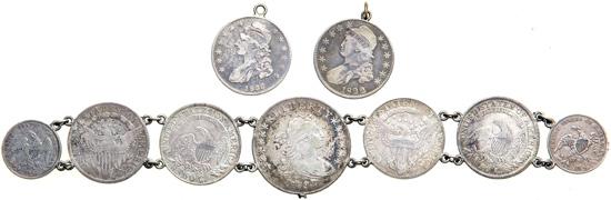 Unusual Bust Coinage Silver Bracelet Ensamble. This fascinating bracelet consists of the following 7 coins, each connected by soldered ring attachments: 1798 Large Eagle Silver Dollar; 1803 Draped Bust Half Dollar; 1806 Draped Bust Half Dollar; 1809 Capped Bust Half Dollar; 1810 Capped Bust Half Dollar; 1834 Bust Quarter; 1835 Bust Quarter. Also included: 1822 and 1836 Capped Bust Half Dollars. With the exception of the mentioned soldiering, the coins will grade VF to EF. Undoubtedly assembled and worn in the early 19th century. A unique numismatic item!