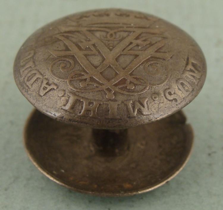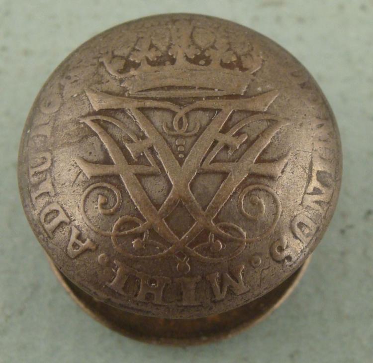 This button was made from XII Skilling coin from Denmark, dated 1716. Both sides have a coin, except one side is mostly worn. The main side still shows the crown and design well. Its diameter is approximately 23 mm. Its condition is good, with wear, and a nick on the reverse.