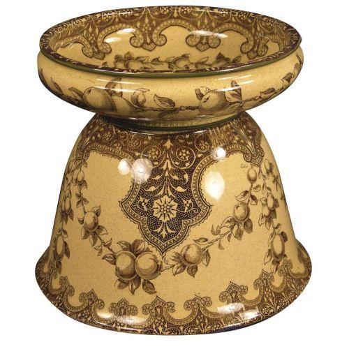 Ceramic spittoon, unusual base and bowl, brown and gold in color. No chips or cracks, excellent condition. 8 inch diameter X 8 inches tall.