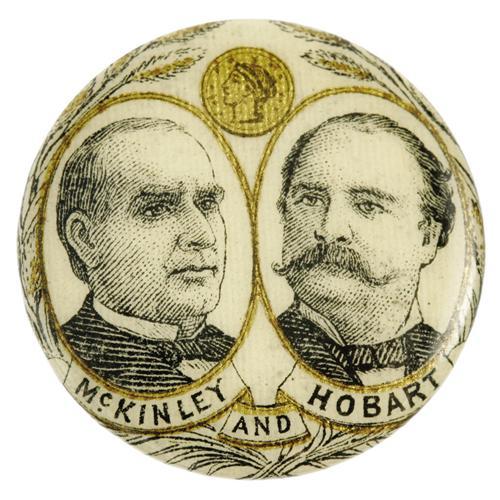 <B>Most Unusual Color-Tinted 7/8" McKinley & Hobart Jugate Design.</B></I> Most attractive, with "gold coin" above their portraits. We cannot recall having seen this distinctive, unlisted jugate before. Lapel stud back, choice condition. <I>From the Norman Loewenstern Collection.</B></I>