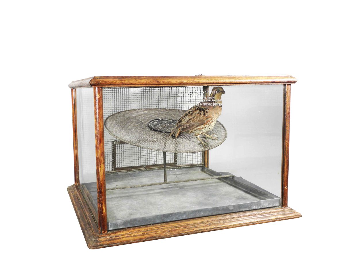 Country Store Live Bird Cage Display. Patented 1897. Oak, wire and glass. This is one of the most unusual items we have come across. Etched Glass. Good original condition. 21 X 14 X 21 inches.