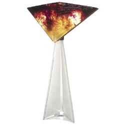 Unusual Decorchmont lamp, angled and ribbed shade in mottled yellow and purple glass held in a copper frame with its original patina atop a clear and frosted glass triangular base, shade signed, 21.5”h, striking example