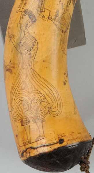 Description Engraved "A Can Hopkins Hearts Co(n)tent (sic) 1821" along with a mermaid, porpoise, full figures of women, sailor, ship, horse, rider, and other figures. This example was probably a sailor's horn and has a unique spout-stopper. Condition (Good). Size 12 - 1/2" L.