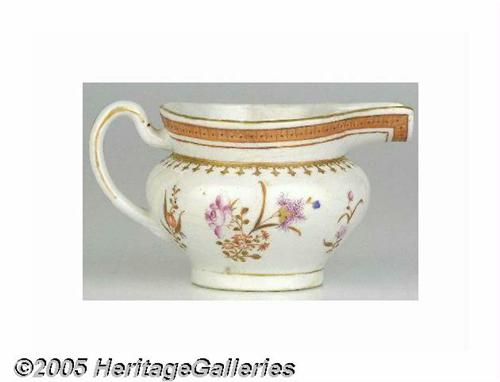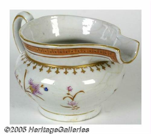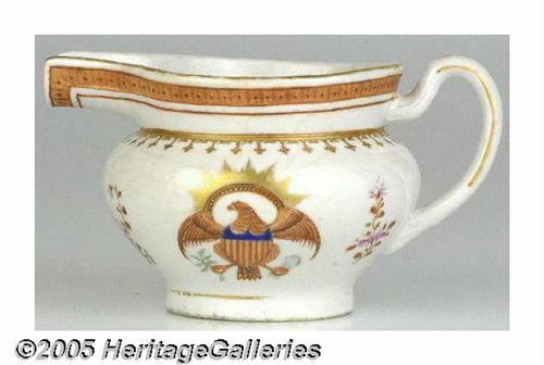 <B>Unusual Form of Early Chinese Export Porcelain Pitcher</B></I> Beautiful, very early 19th century piece, with bold Federal eagle and delicate floral decoration. Most unusual form of pouring spout; it has been suggested that this type of vessel was used to feed invalids. Excellent condition, but for some extremely subtle hairline cracking. Height 3.75", diameter including handle is 6.5". Lot:252