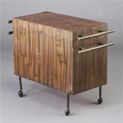 Unusual French bar cart, c 1970, clad with acid-etch copper veneer, with lift top bar and side drawers with interior fittings, on casters. 28" x 36" x 16" $1,000 - 1,500