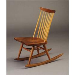 Unusual GEORGE NAKASHIMA spindle-back rocker with walnut saddle seat and hickory spindles. Marked with the name of the client, from the collection of the original owner. Provenance available. 33" x 19" x 29" $2,500-3,500