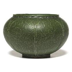 Unusual Grueby vase, round form with broad vertical sculpted leaves covered with a wonderful green suspended matt glaze, impressed mark, artist signed, 3.5”h, minor chip to rim