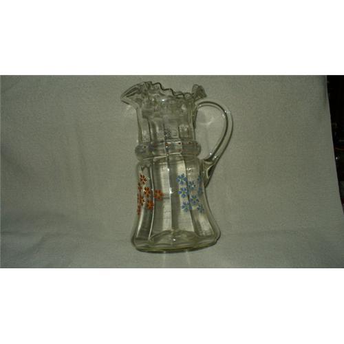 This is a very unusual vintage pitcher, it is handpainted and has the pontil on the bottom.It has a ribbon edge around the top and a middle band,it alson has ribbing. This is the first one like this I have seen.