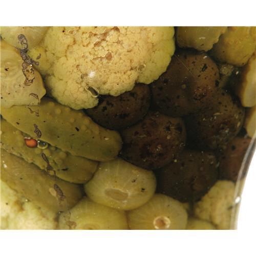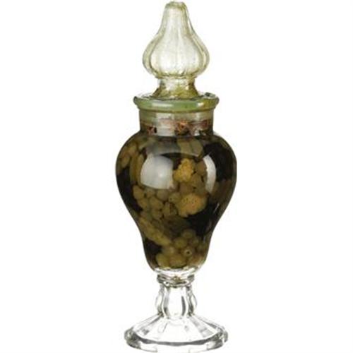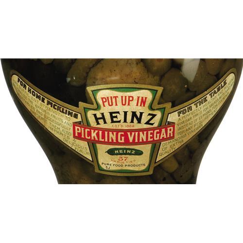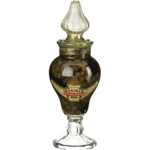 <B>Unusual Heinz Display Jar with Original Product.</B></I> Surely a rare find. This 19" clear glass display jar with front label reading, "Put Up In Heinz," was a marketing tool for their Pickling Vinegar used to store homemade products and for table use. Complete and original with only minor discoloration of the paper label on the front and no chips or problems in the glass. Sealed many years ago, it's a once-in-a lifetime opportunity to acquire a piece like this to display in your country store collection.