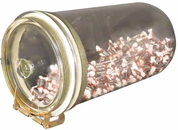 Unusual Horizontal Glass Store Candy Jar. Glass lid, no chips or cracks. 17 inches long X 8 1/2 inch diameter.