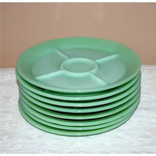 Produced by Anchor Hocking Glass Company we are presenting the hard to find vintage Jadeite Fire King 5 Compartment Plates produced between the 1940s and 1960s. Each Plate measures 9 5/8 inches in diameter with five compartments on each Plate. Marked on the bottom Fire King Ovenware; appearing to have never been used and free of any chips, cracks, flea bites or scratches. Still retaining their wonderful original shine!