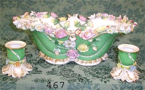 Unusual Japan console set in green and enamel floral dec. with applied flowers. Bowl is 11 ½”. Marked Halsey Fifth.
